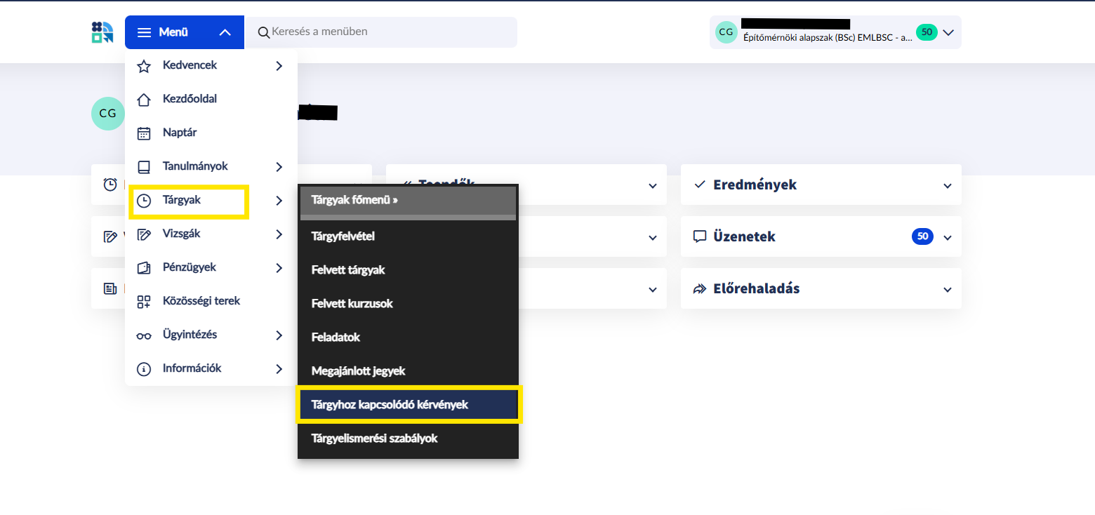 A kérvényt az adott elismertetni kívánt tárgyról tudja elindítani a Tárgyak>Tárgyhoz kapcsolódó kérvények menüpontban.