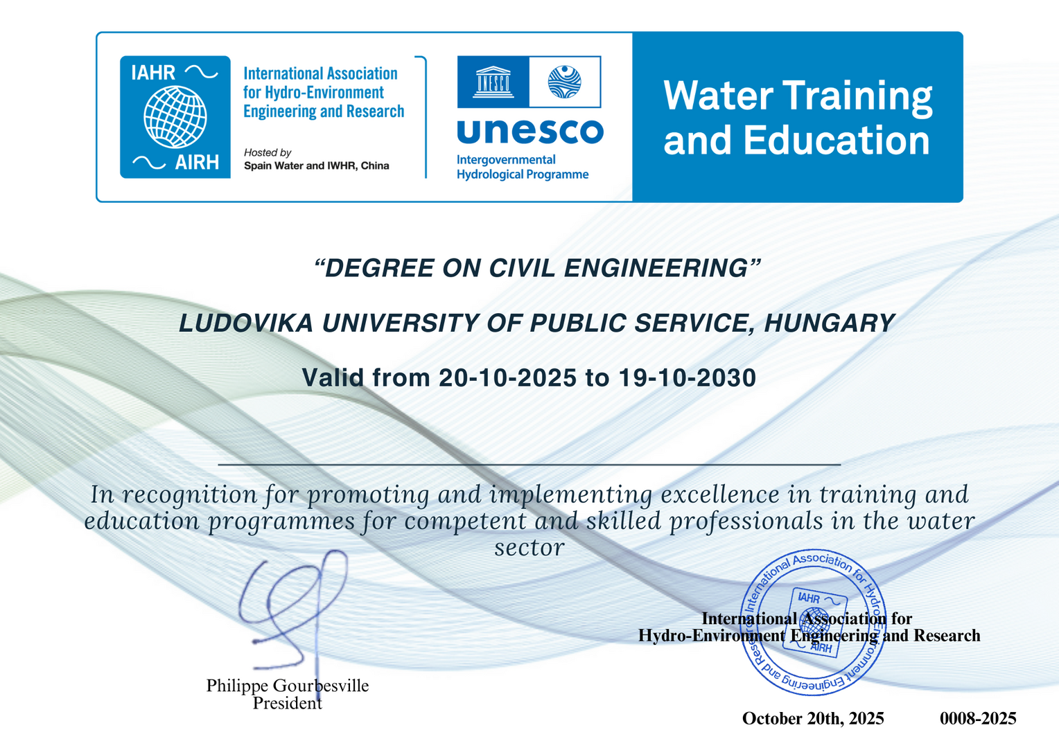 A Víztudományi Kar Építőmérnöki BSc képzése októberben elnyerte az IAHR és az UNESCO IHP Vízgazdálkodási képzési és oktatási minősítését (Label for Water Training and Education).