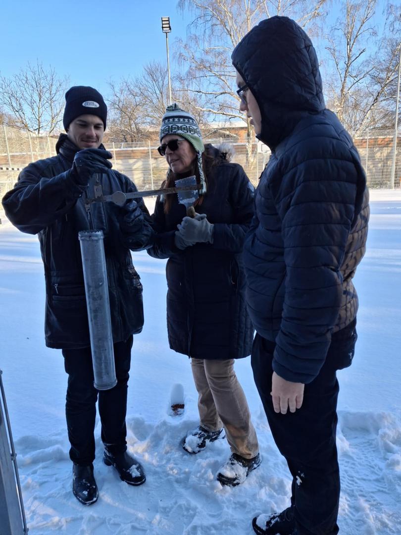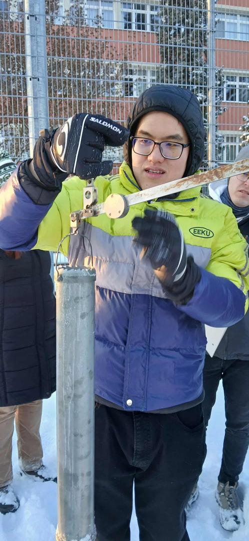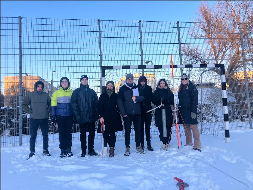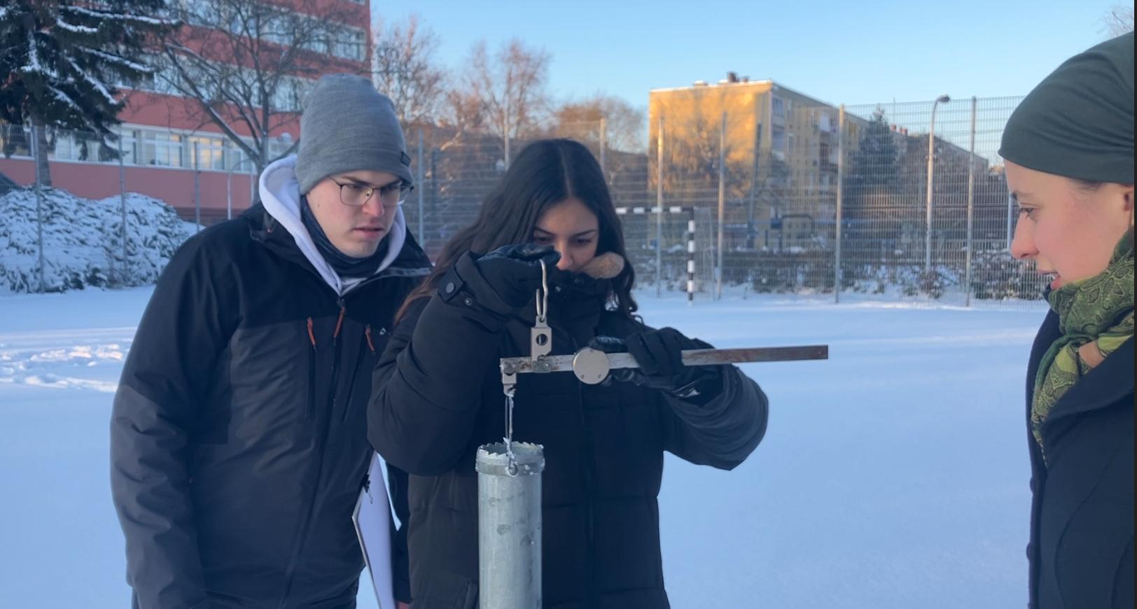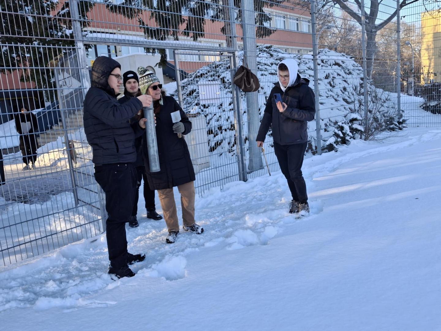 A Víztudományi Kar néhány lelkes, vállalkozó szellemű hallgatója Tamás Enikő Anna tanárnő vezetésével január 8-án a délutáni órákban hómérési gyakorlatot végzett a Campus udvarán ún. mérleges hómérővel. Mintaterületnek a sportpályát választottuk, hiszen itt a felület egyenletes, a hóréteg pedig érintetlen volt, és a mérést növényzet sem zavarta.