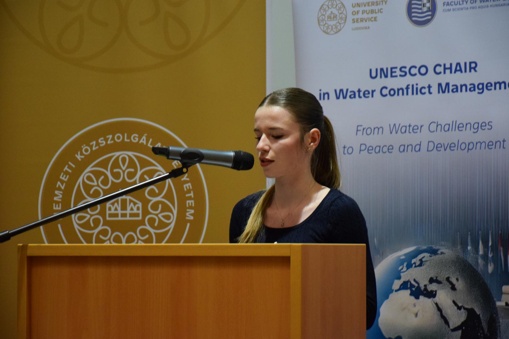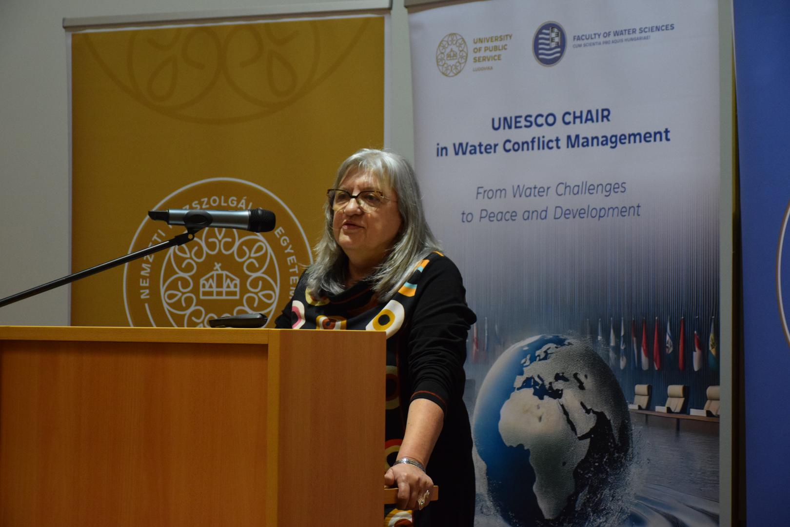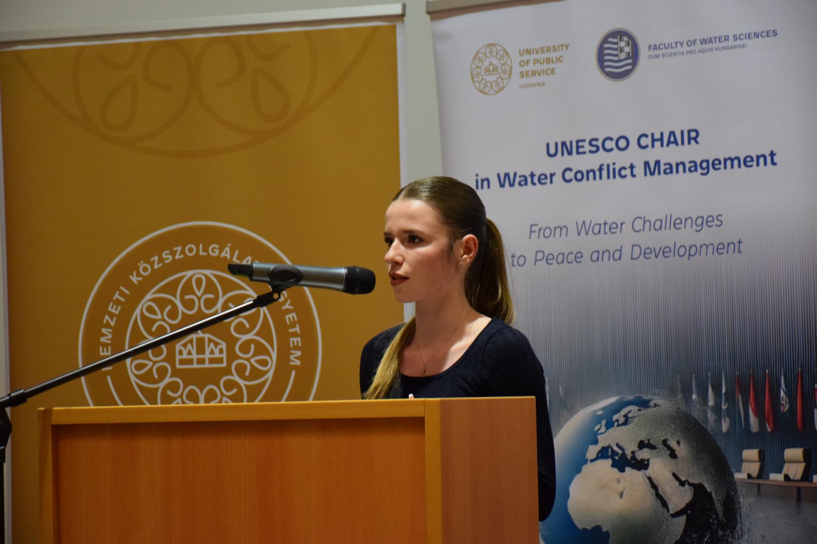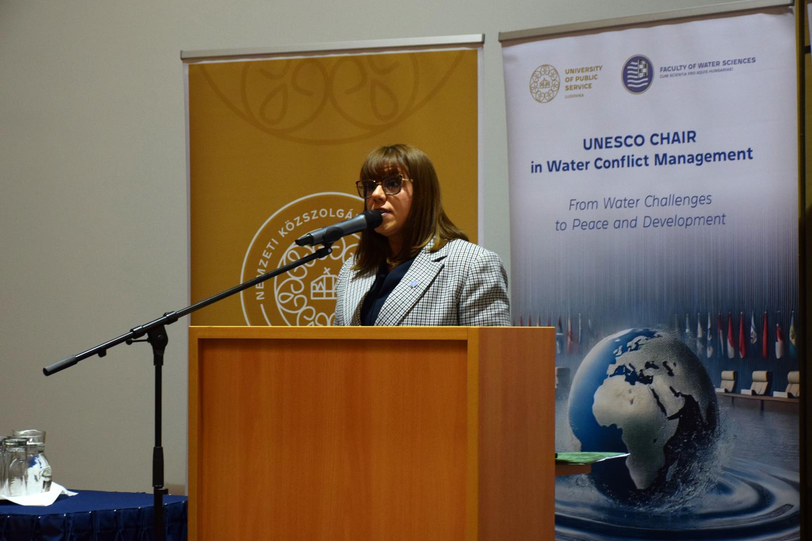 Kovács Ágnes, a VTK Víz-és Környezetpolitikai Tanszékének tudományos munkatársától az UNESCO vízkonfliktus-kezeléssel foglalkozó tanszékének személyi összetételéről, programjairól és jövőbeli céljairól hallhattak a rendezvény résztvevői.