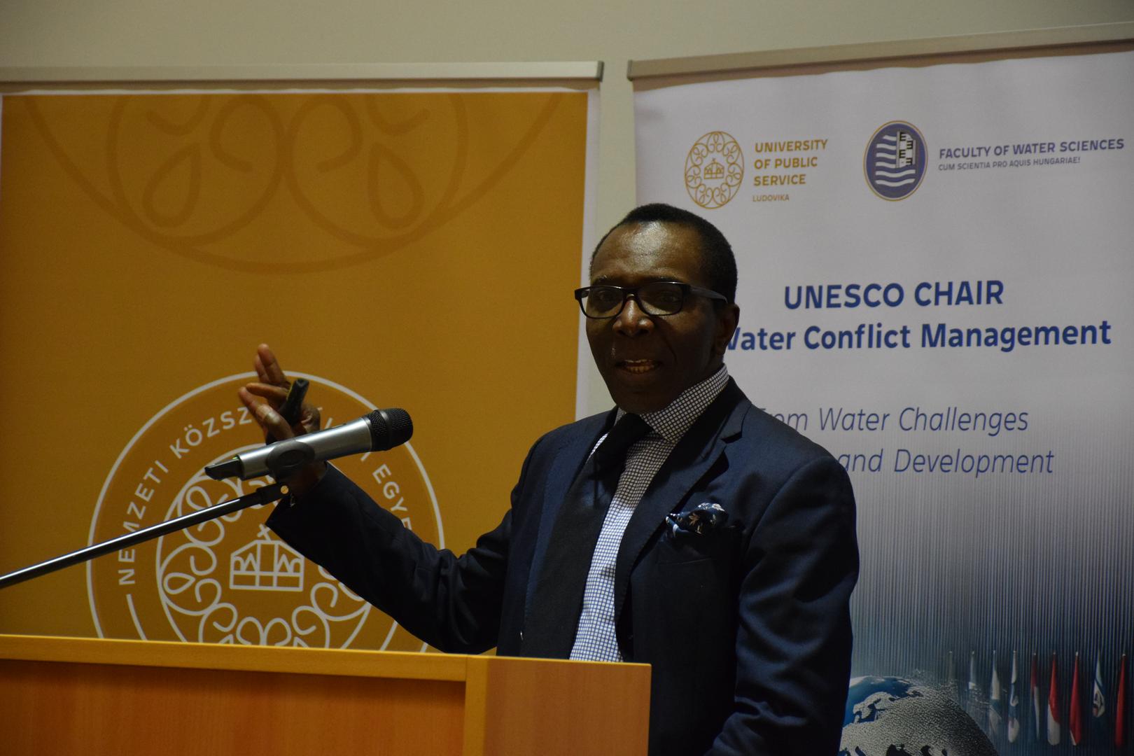 Rock A. Missamou Afrika-szakértő, az UNESCO Vízkonfliktus-kezeléssel foglalkozó tanszékének munkatársa prezentációján keresztül képet adott Afrika földrajzi viszonyairól, valamint a nőkre háruló vízellátással kapcsolatos terhekről.